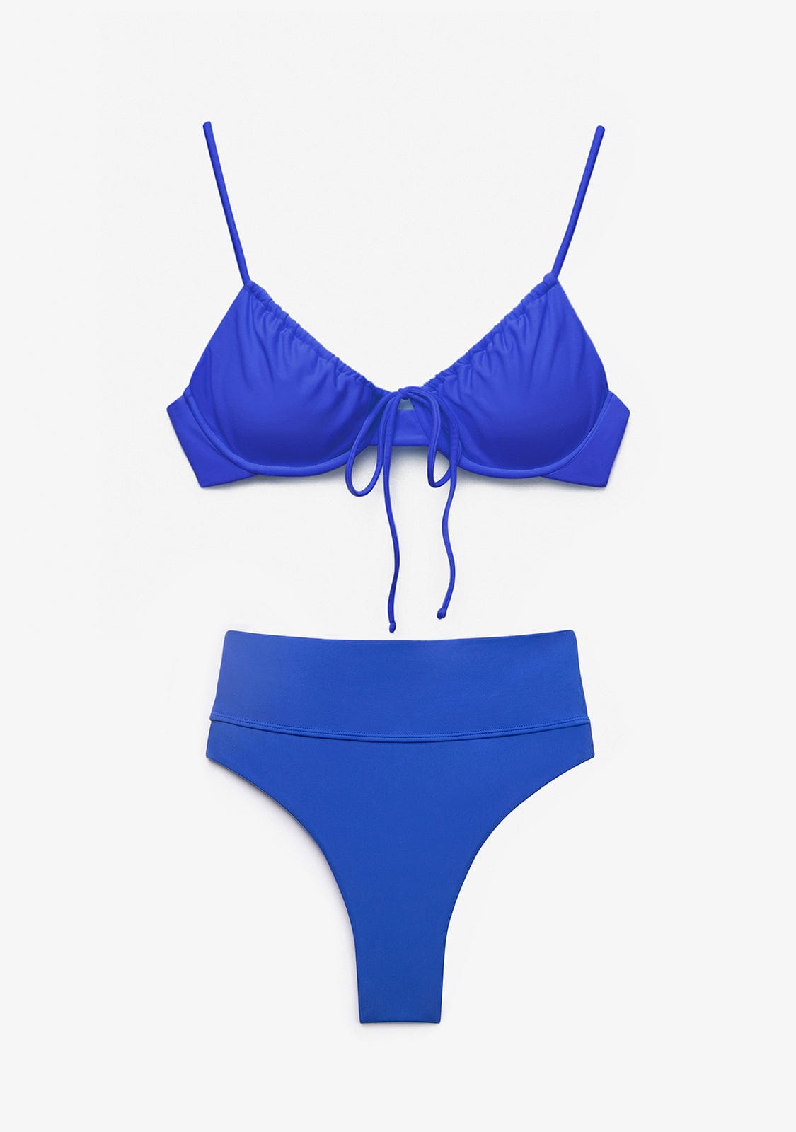 Indigoblaues Balconette-Bikinioberteil. Mit Bügel. Ohne Schaumstoff im Inneren. Verstellbare Schultergurte. Spitzenverschluss.