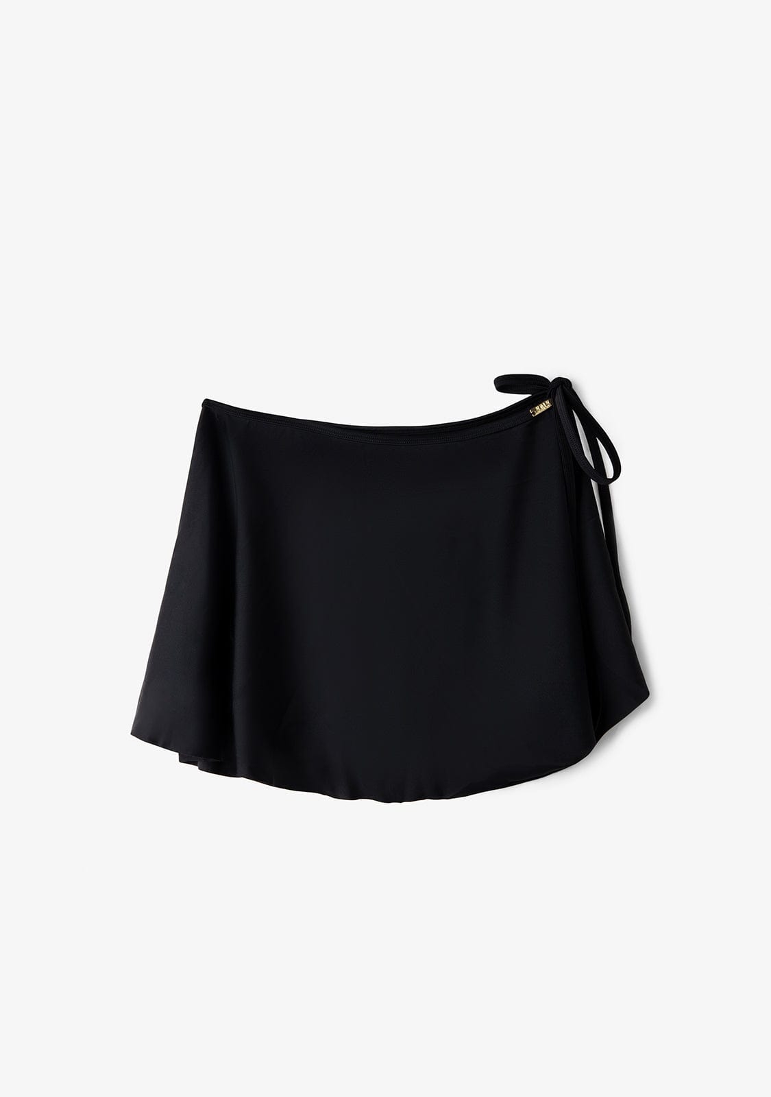 Schwarzer Sarong -Rock. Mit Bug und Seitenöffnung. Mit goldenem rechteckigen Metallplattendetail mit Kalk -Logo.