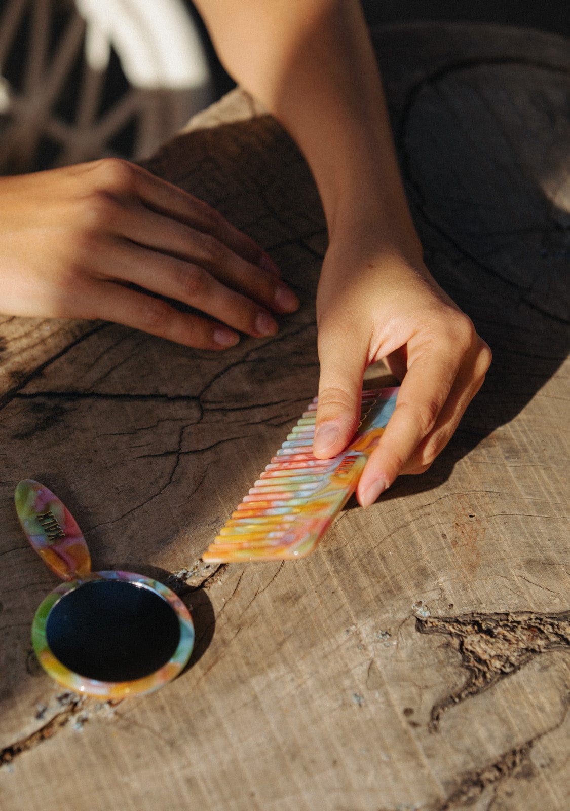Die Spiegeltasche Multi Kalk ist Teil der neuen Kalk Accessories Kollektion. Ein farbenfroher Spiegel im Miniaturformat, der überallhin mitgenommen werden kann, wann immer man ihn braucht.