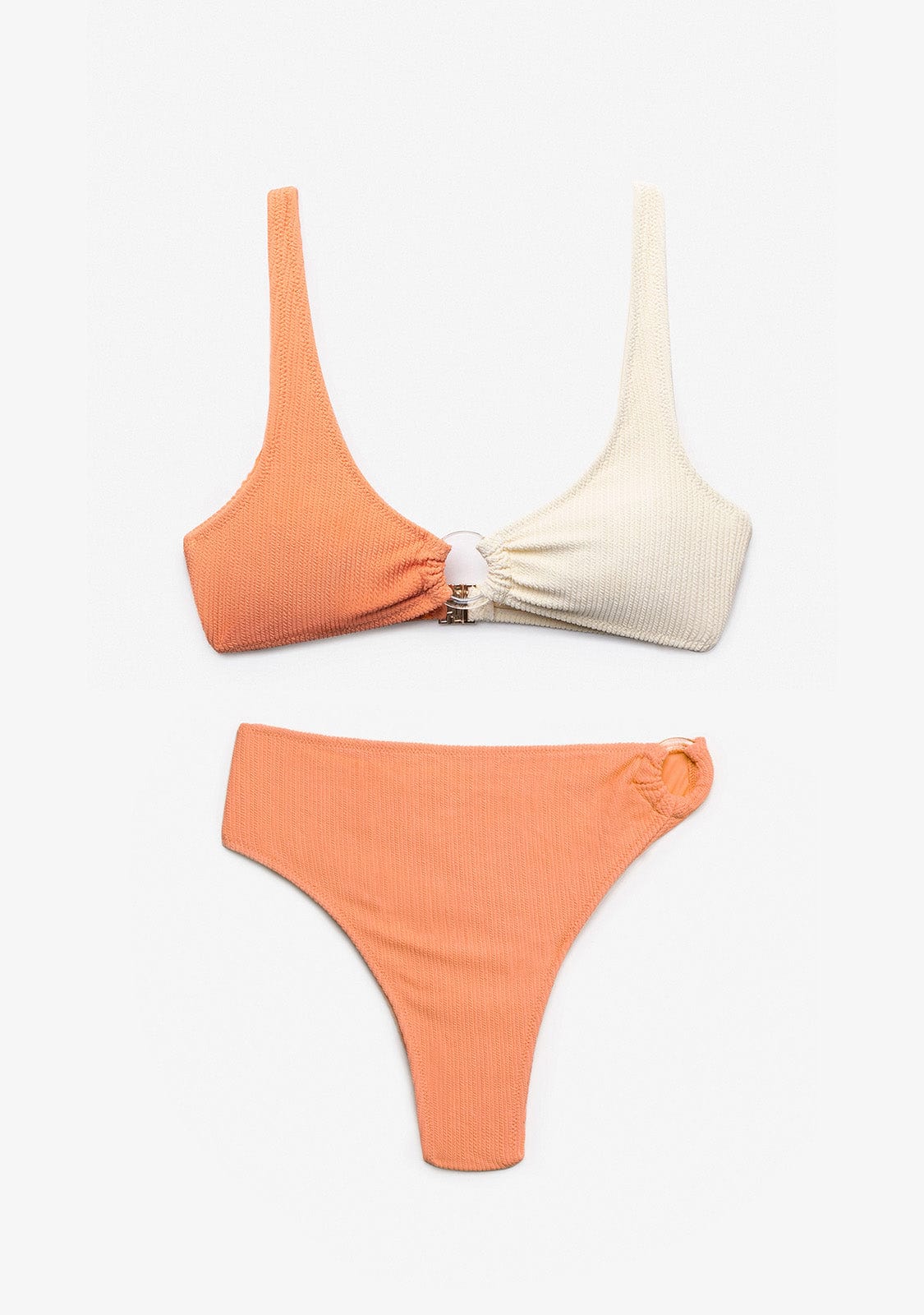 Top bikini con escote en V de color melocotón y beige. Sin aro. Con foam extraíble. Tirantes extraíbles con regulador ajustable. Cierre metálico.