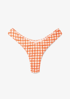 El modelo Gina Bottom Charlotte se caracteriza por su corte brasileño y su escote en V en la parte delantera. De talle alto y con el corte en la parte superior de las caderas, contiene una placa metálica rectangular dorada en la parte trasera con el logotipo de Kalk.