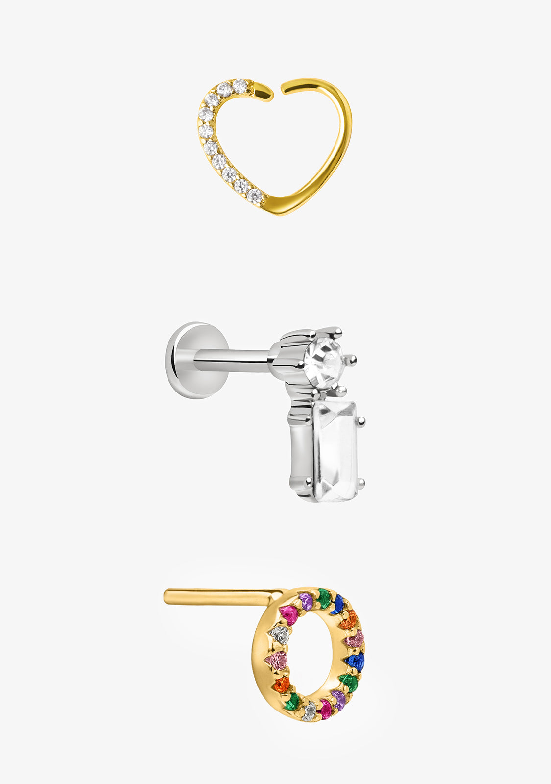 Soft reúne tres piercings en tonos dorados y plateados -Rainbow Gold, Heart Gold y Bloq Silver- diseñados para crear combinaciones suaves y versátiles para cualquier look. Rainbow Gold está elaborado en plata de ley 925 bañada en oro de 18 quilates con circonitas situadas a mano, lo que lo convierte en una pieza más delicada y única. Heart Gold y Bloq Silver, de acero hipoalergénico con circonitas, pueden llevarse en múltiples ubicaciones como hélix, tragus o concha, añadiendo un toque equilibrado de brillo y minimalismo. Todas las piezas son resistentes al agua e incluyen una garantía de 3 años.