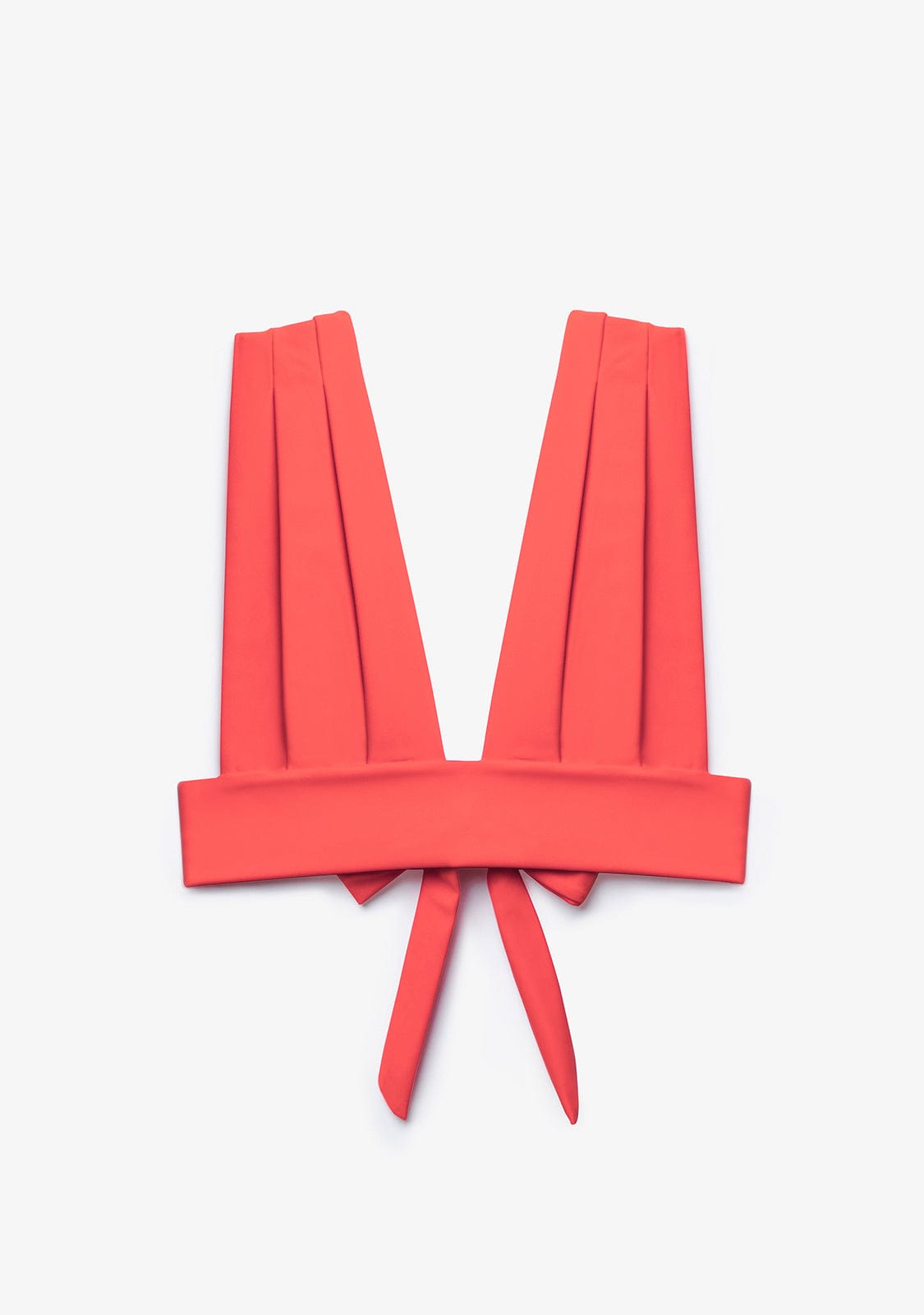 Top de bikini avec ligne de col en V en couleur corail. Pas de sous-armature. Sans mousse intérieure. De larges sangles fixées aux épaules. Fermeture en boucle.