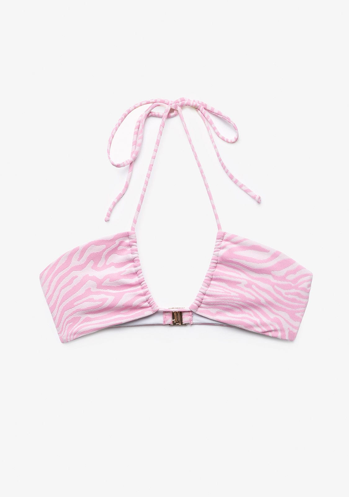 Top Triangle Bikini inversé avec imprimé zèbre en rose et blanc. Pas de sous-armature. Avec mousse amovible. Sangles à nouer au cou ou au dos. Fermeture en boucle.