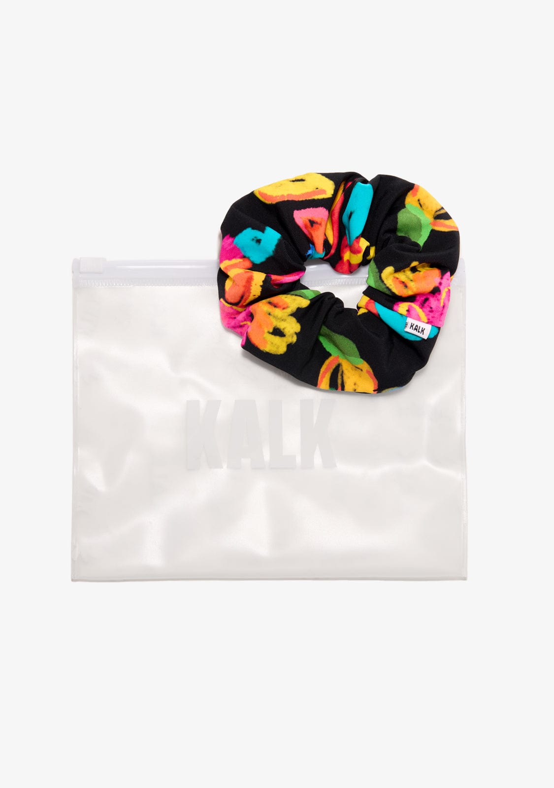 Scrunchie en tissu élastique avec imprimé Bloom multicolore sur fond noir. Détail de l'étiquette Kalk.
