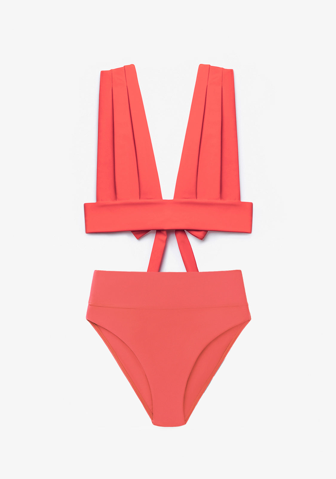 Il top bikini color corallo presenta uno scollo a V lusinghiero con ampie spalline fisse che offrono una vestibilità sicura e confortevole. Progettato senza ferretto o schiuma interna, offre una sensazione naturale e una silhouette pulita, rifinita con una chiusura ad anello per indossarla facilmente.
