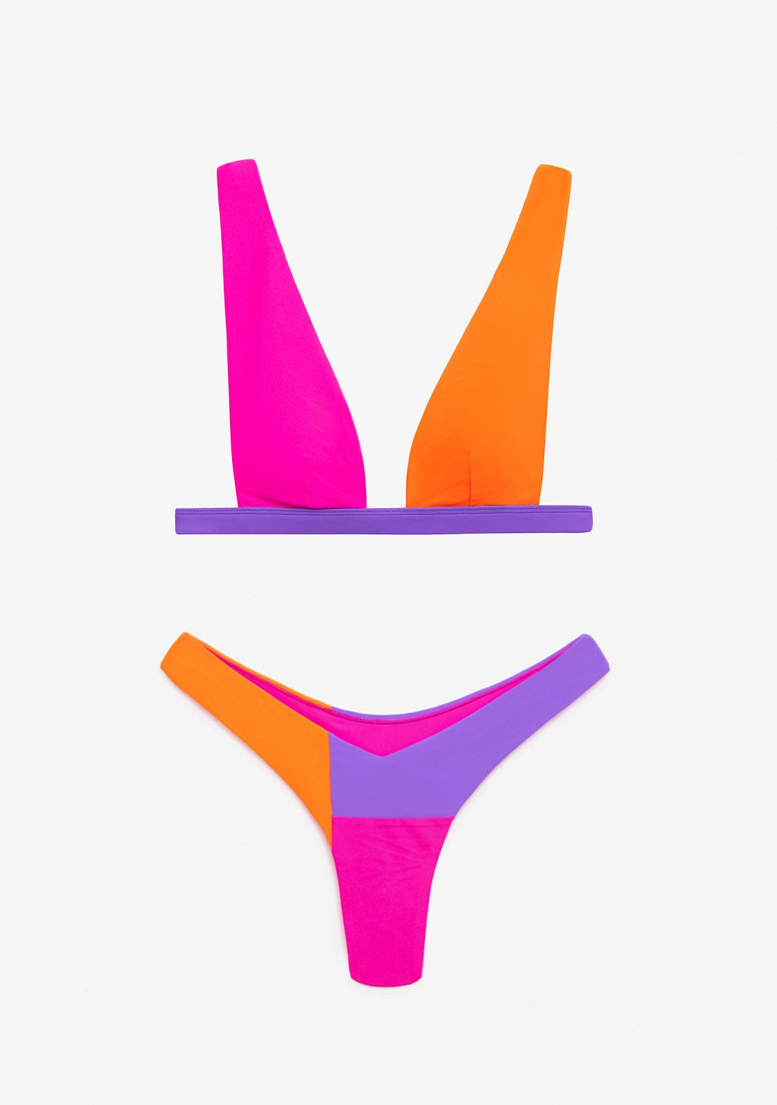 Top bikini con scollo a V in fluoro multicolore. Senza ferretto. Con schiuma rimovibile. Spalline fisse. Chiusura in metallo.