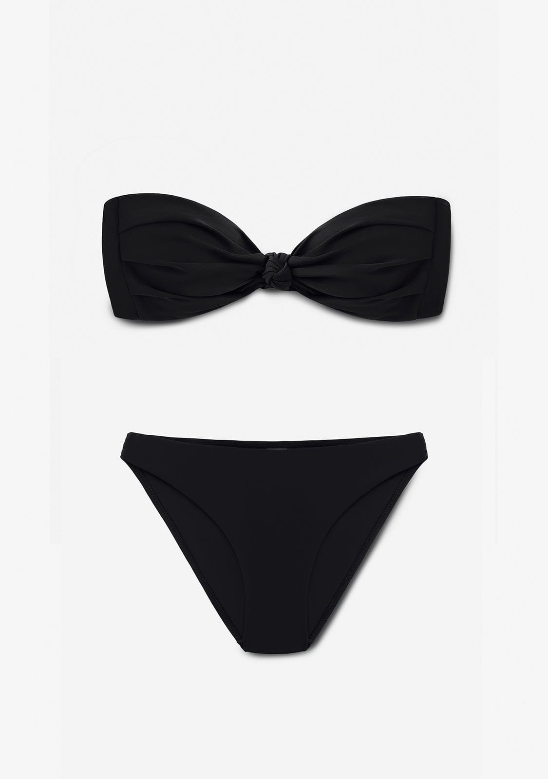 Top bikini a fascia con nodo centrale in nero. Senza ferretto. Con schiuma rimovibile. Cinghie removibili con regolatore regolabile. Chiusura in metallo.