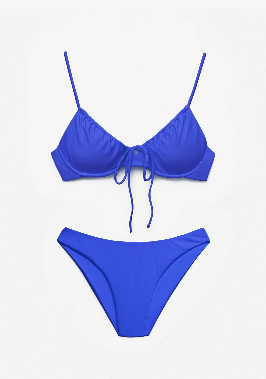Top bikini a balconcino blu indaco. Con ferretto. Senza schiuma all'interno. Spallacci regolabili. Chiusura in pizzo.