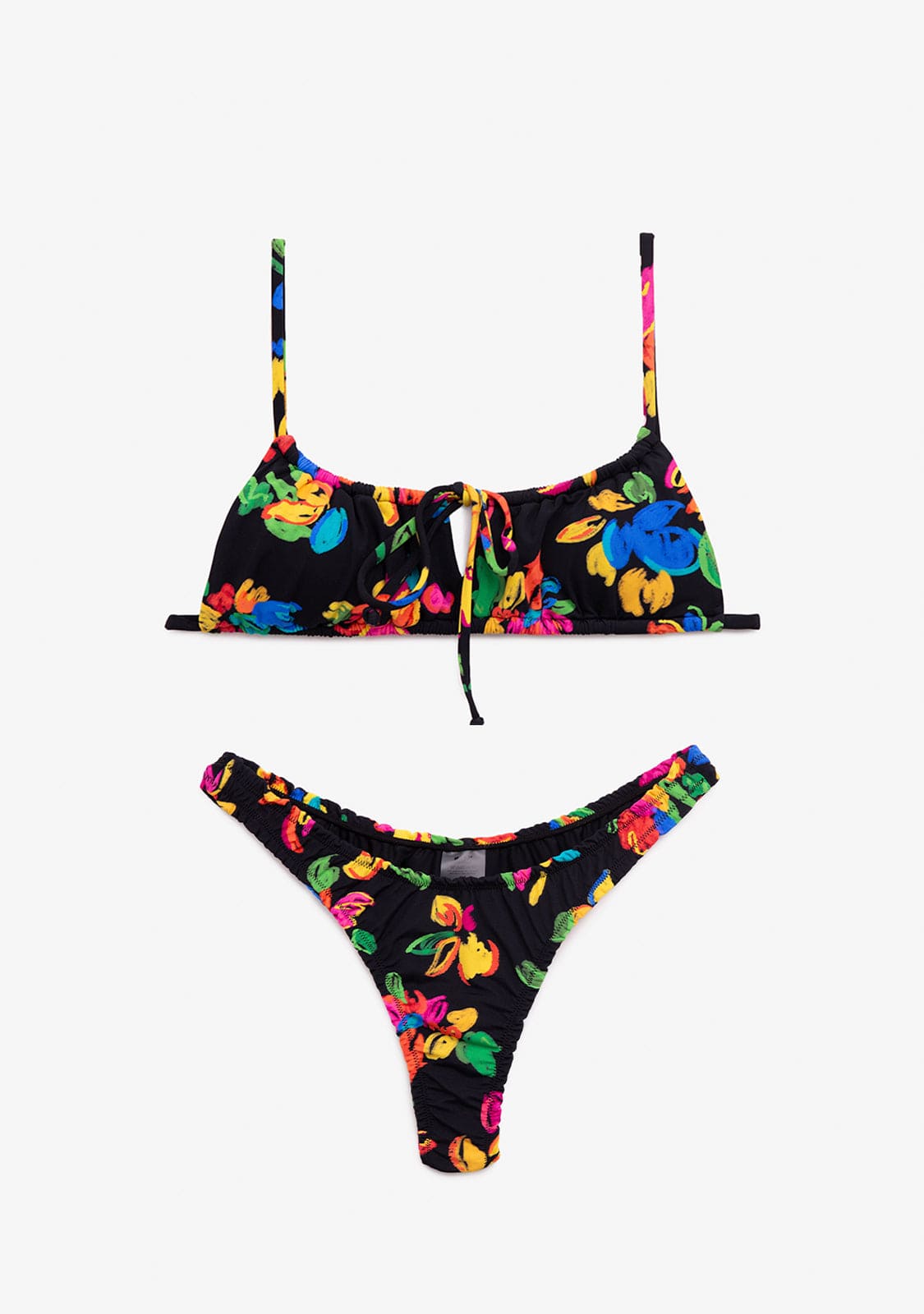 Taylor Top Bloom: Top bikini a fascia con stampa di fiori multicolore su sfondo nero. Senza ferretto. Con schiuma rimovibile. Spalline regolabili con allacciatura. Chiusura regolabile in metallo.