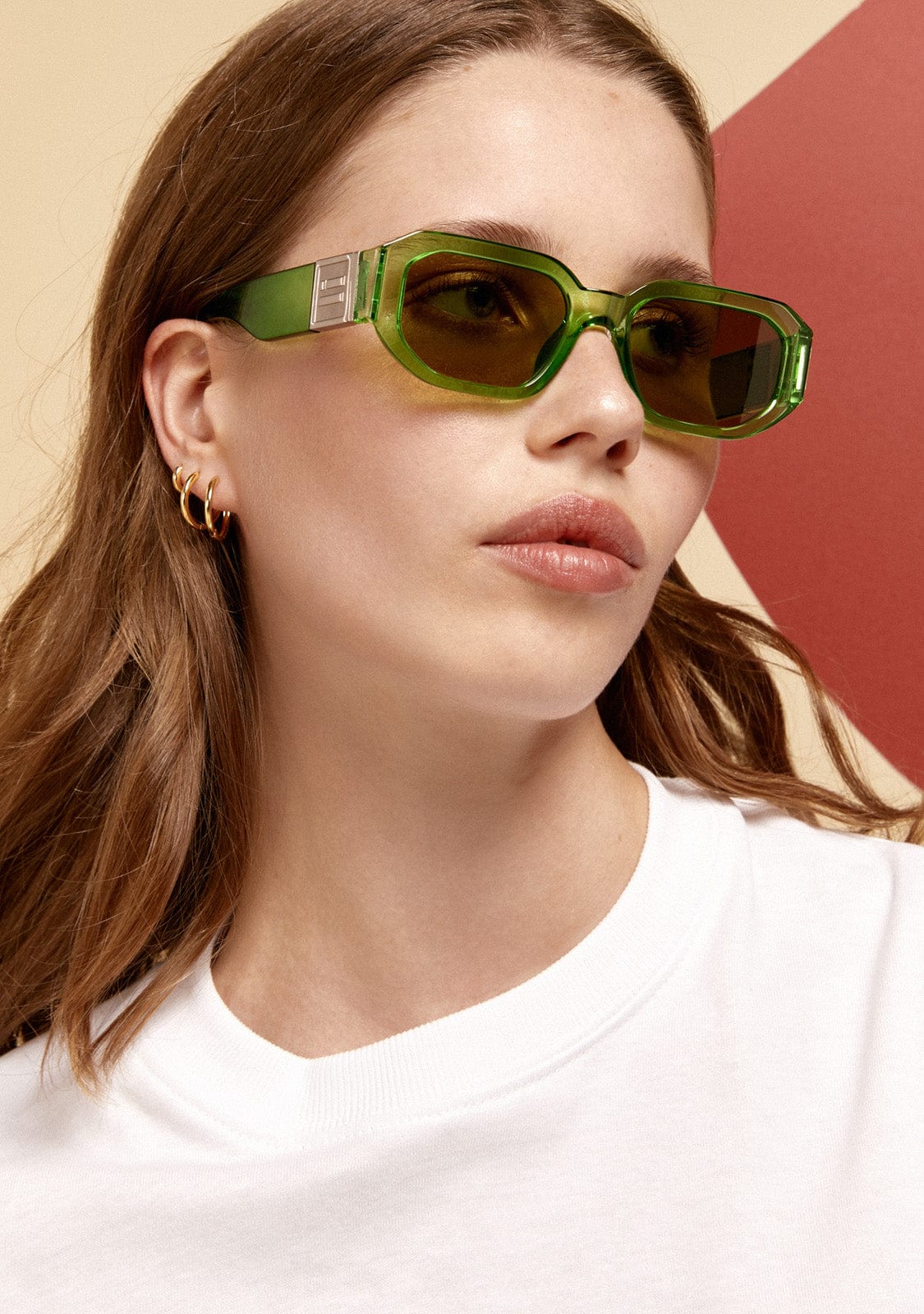 Emblema HEX occhiali da sole, un design geometrico che incornicia gli occhi. Lenti polarizzate e la montatura verde esaltano l'estetica di questo modello. Presentano l'inconfondibile bandiera di D.Franklin con una finitura in oro metallizzato su entrambe le aste. Con una larghezza delle lenti di 52 mm e una montatura anteriore di 139 mm, questi occhiali si adattano alla maggior parte dei visi. Le aste laterali hanno una lunghezza di 140 mm.
