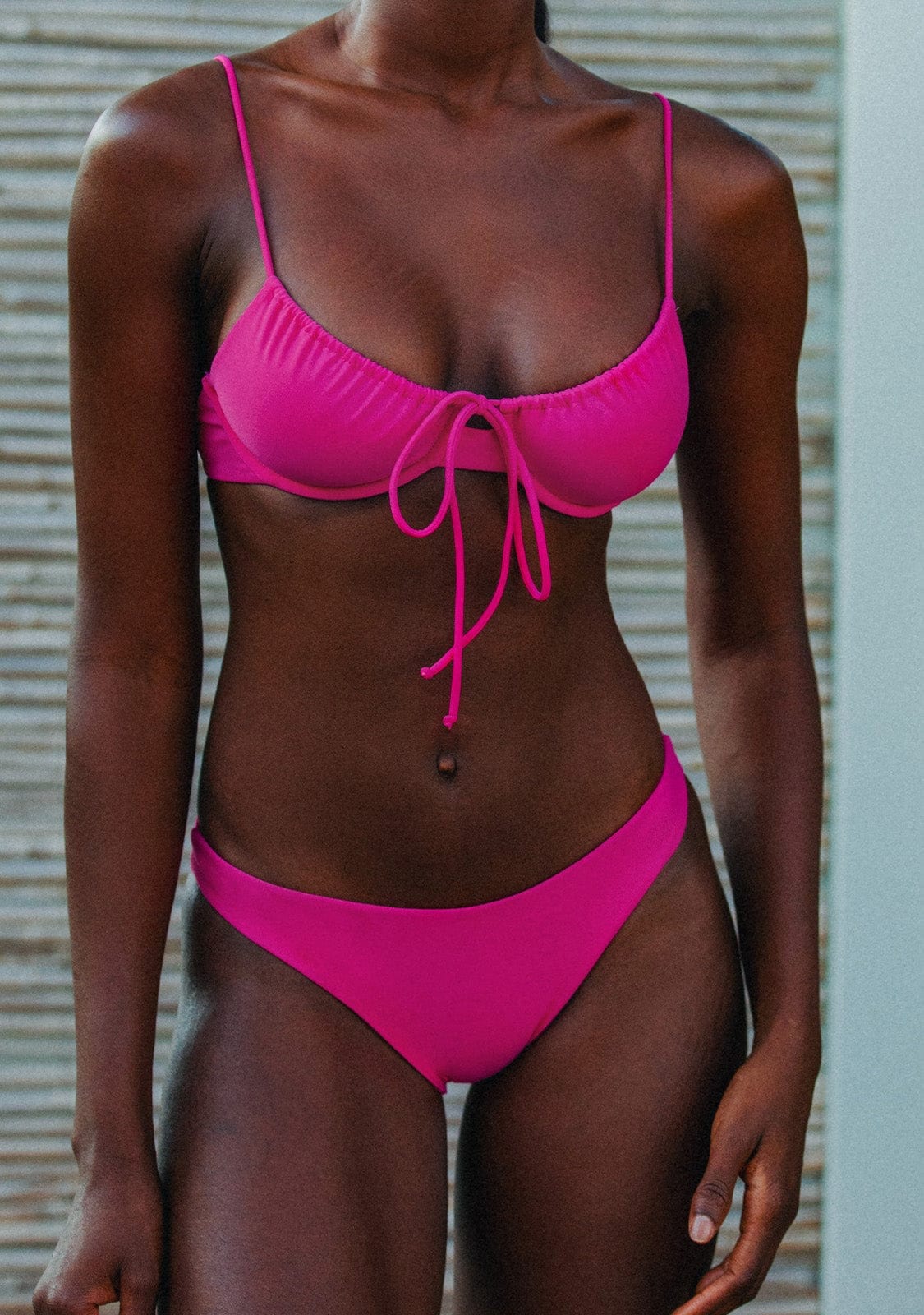 Classico fondo bikini tagliato in rosso. Aumento medio. Copertura media. Dettagli della piastra in metallo dorato rettangolare con logo Kalk.