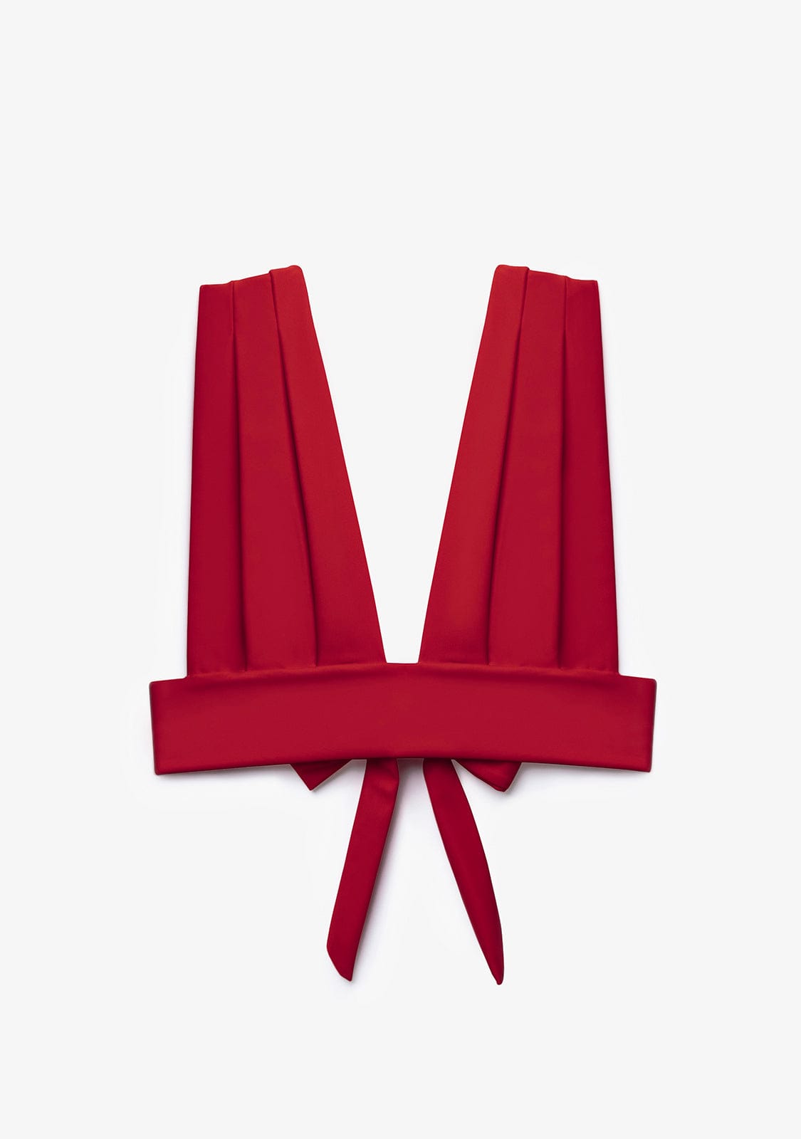 Top bikini con gigante a V in rosso. Nessun sottoversazione, nessuna schiuma all'interno. Cinghie larghe fissate alle spalle. Chiusura con allacciatura.
