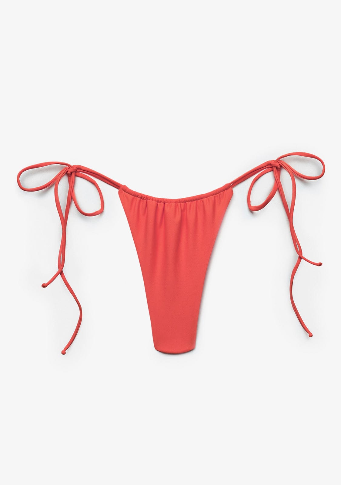 Fondo bikini brasiliano in colore corallo. Copertura ridotta. Con anelli sui lati e dettagli in metallo rettangolare oro con logo Kalk.