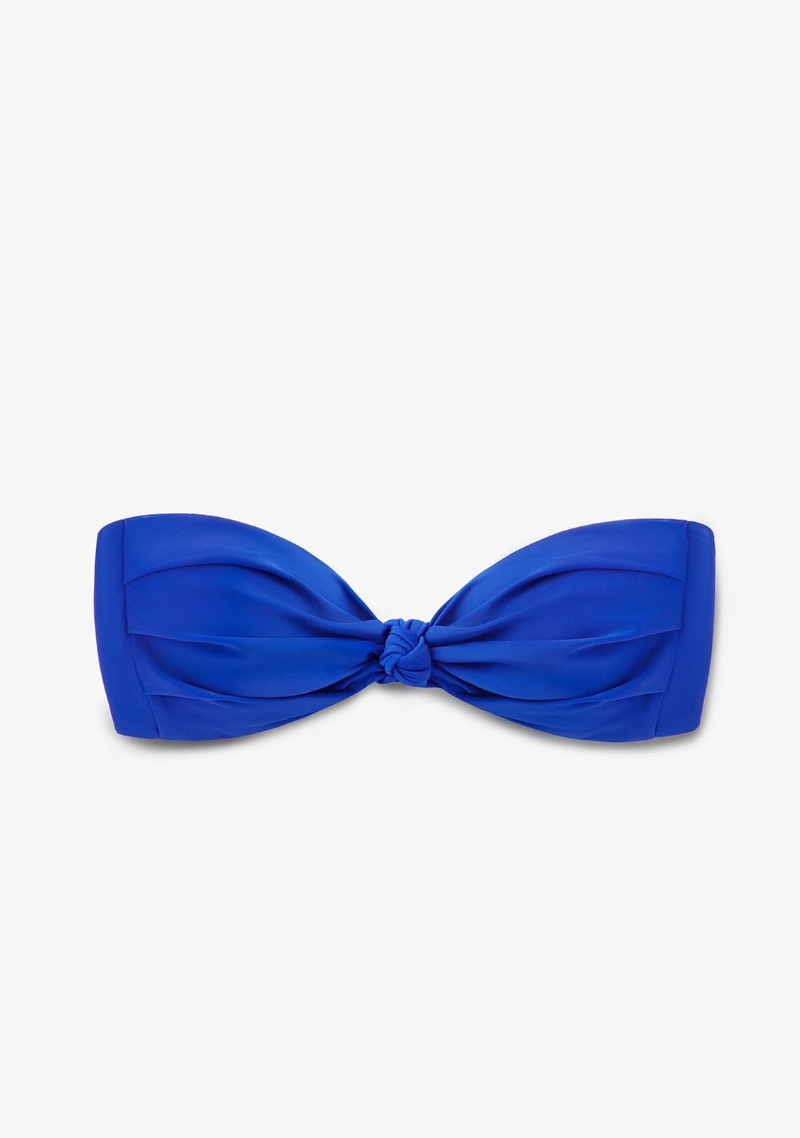 Top Bandeau Bikini con nodo centrale in blu indaco. Nessun sottoversazione. Con schiuma rimovibile. Cinghie rimovibili con regolabile regolabile. Chiusura di metallo.