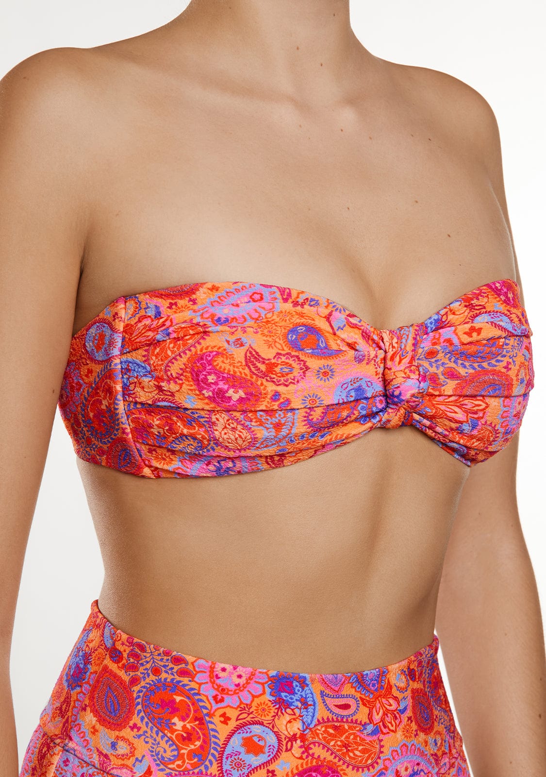 Top Bandeau Bikini con stampa paisley multicolore su sfondo arancione. Senza sottoporre a filo. Con schiuma rimovibile. Cinghie rimovibili con regolabile regolabile. Chiusura di metallo.