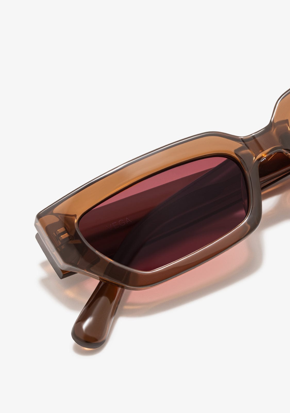 Occhiali da sole con cornice di linea geometrica in finitura traslucida marrone scuro. Lenti da toni del vino.