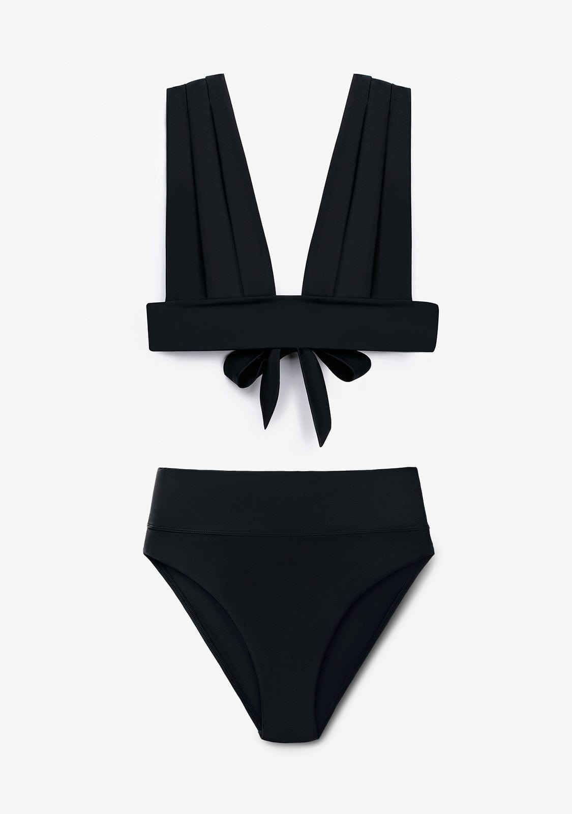 Black bikini top with a V-neckline and wide straps. No underwire, no foam inside. Adjustable lacing closure for a perfect fit.