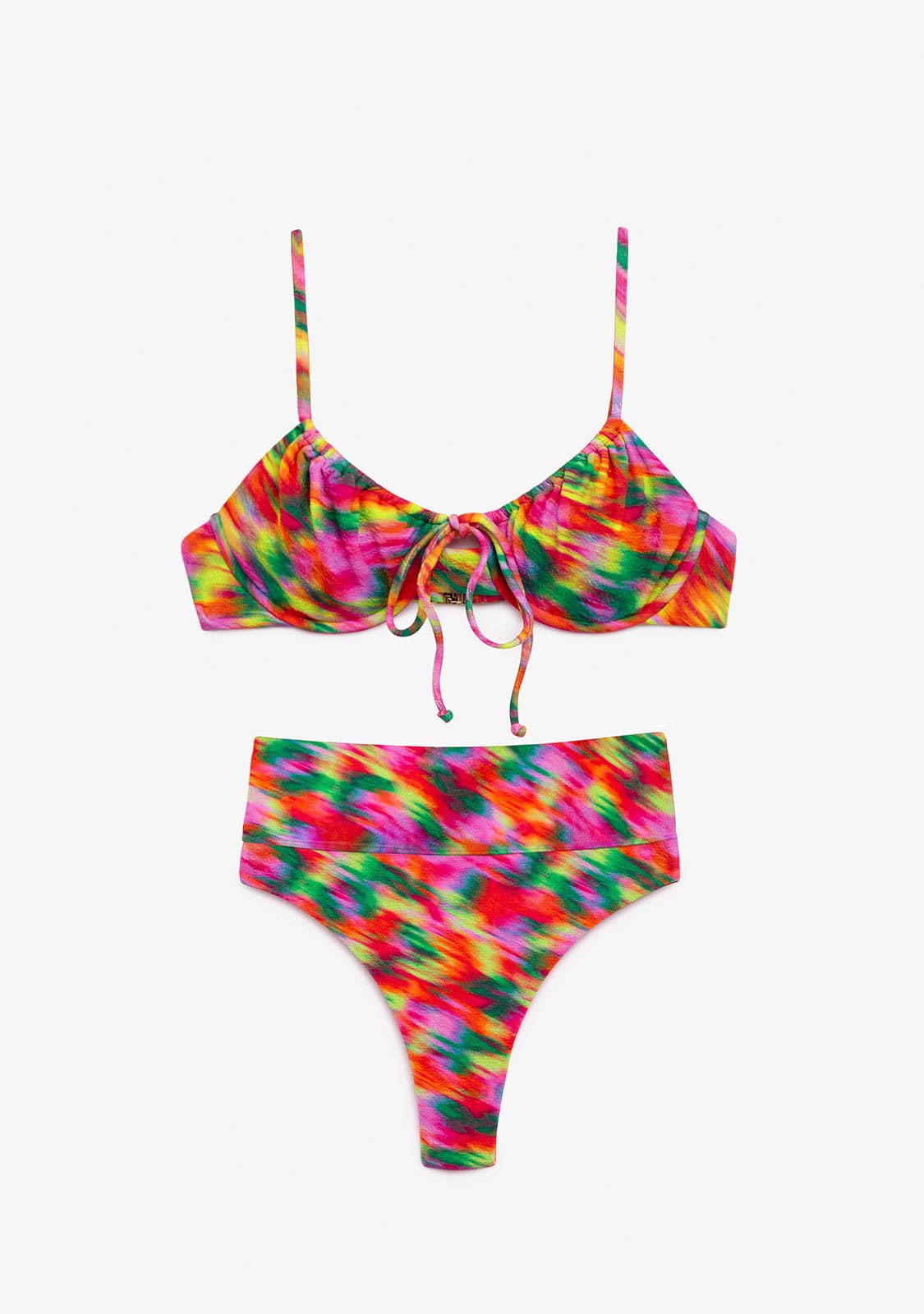 Balconette bikini top with multicolor print. Underwired. Without inner foam. Adjustable shoulder straps. Loop closure.