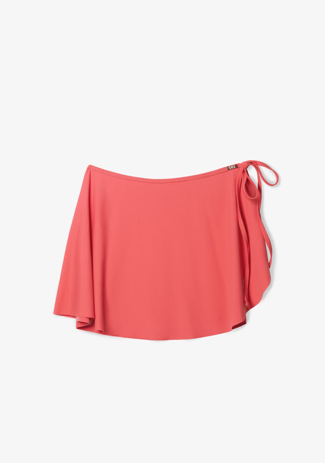 Coral colored sarong skirt. With bow and side opening. With gold rectangular metal plate detail with Kalk logo.
