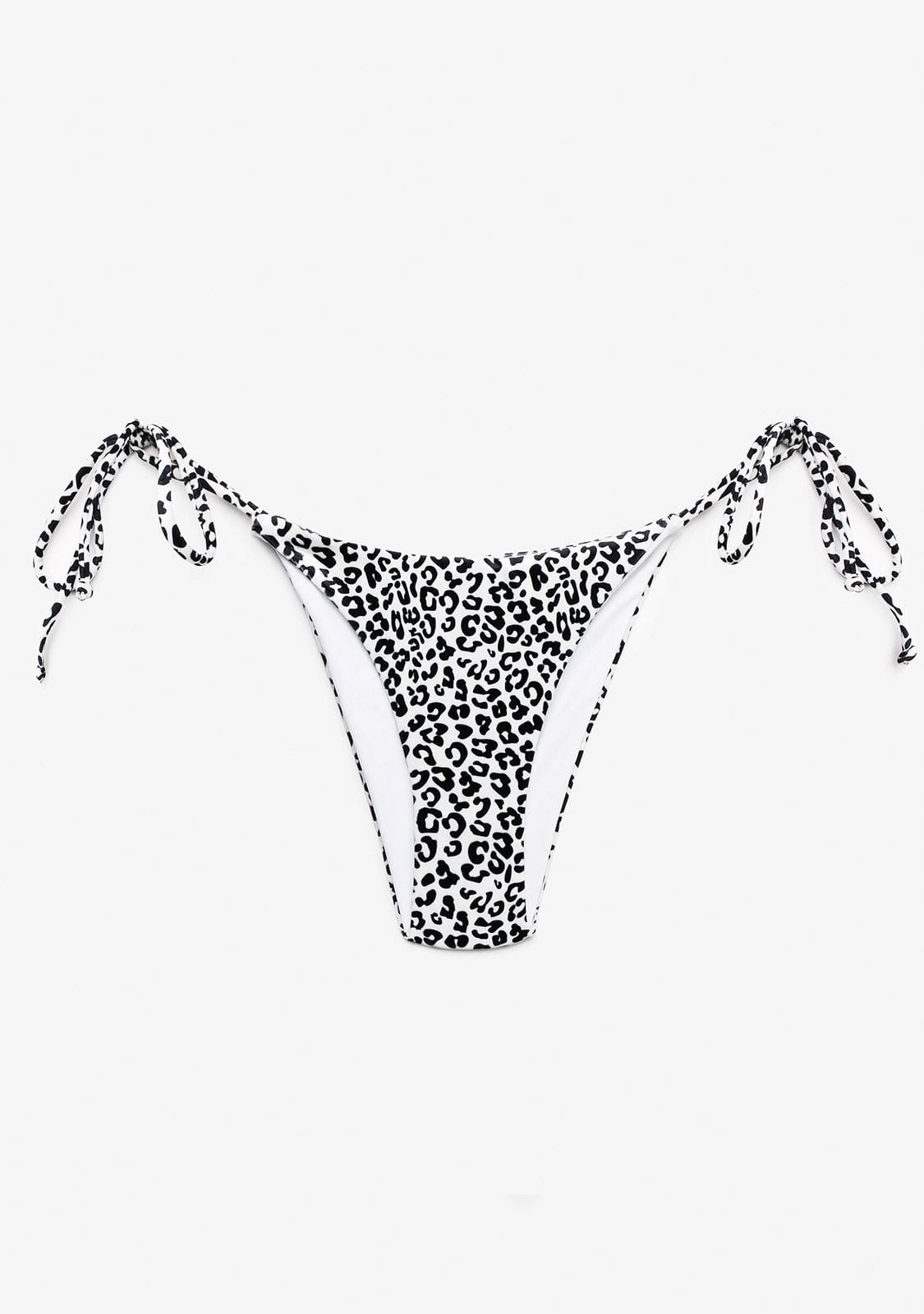Brazilian bikini bottom with leopard print. Low rise. Reduced coverage. With loops on the sides. Gold rectangular metal plate detail with Kalk logo.