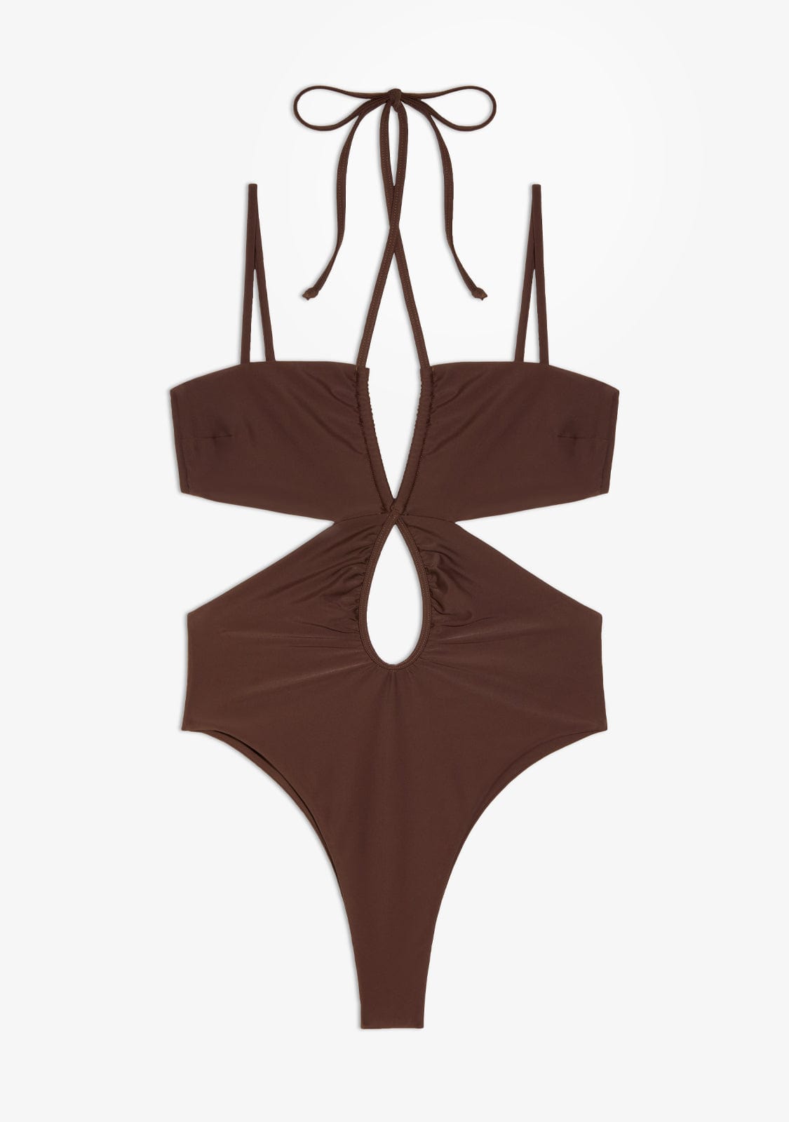 Brown elastic swimsuit with bandana neckline and Brazilian knickers. Detail of cut-out side slits. No underwire. With removable foam. Adjustable shoulder straps and neck tie. Metal clasp with gold plated Kalk logo.