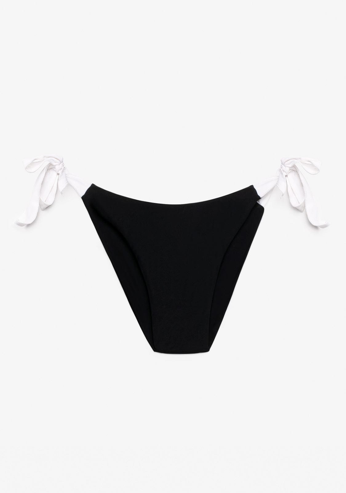 Classic cut bikini bottom in black and white. Low rise. Medium coverage. With loops on the sides. Rectangular golden metal plate detail with Kalk logo.
