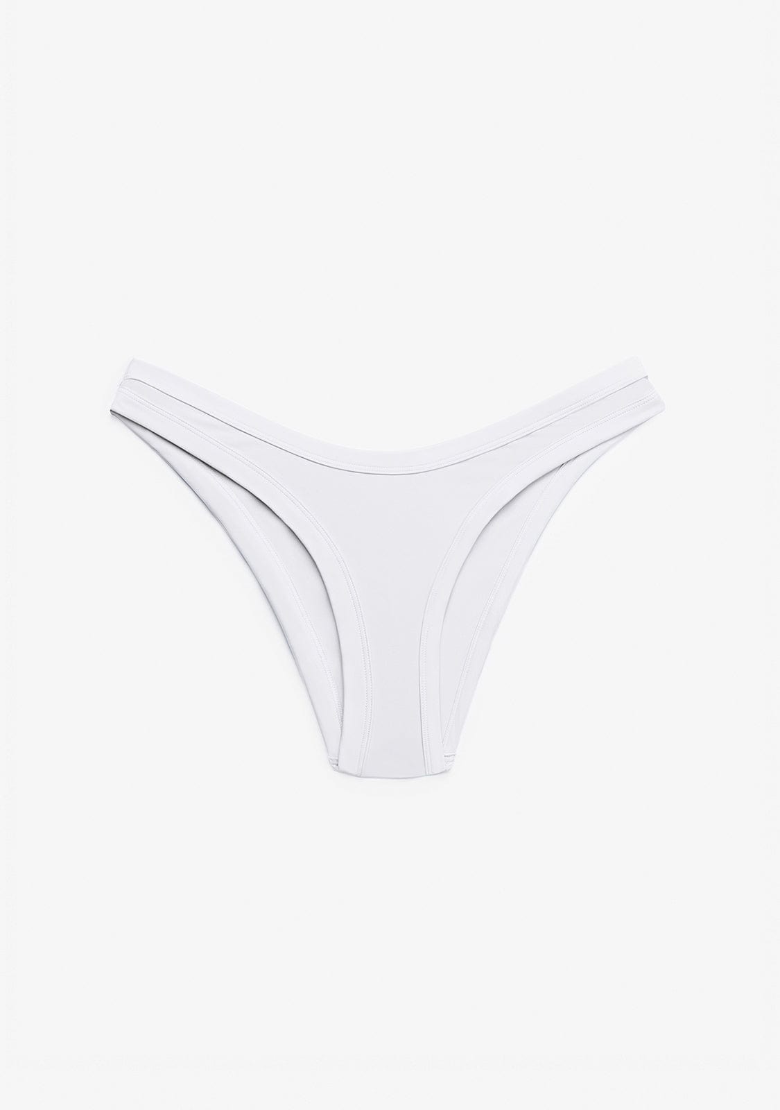 Classic cut bikini bottom in white. Low rise. Medium coverage. Rectangular golden metal plate detail with Kalk logo.