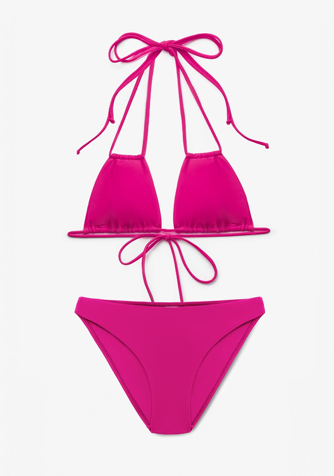 Top de biquíni triangular em fúcsia. Sem armação. Com espuma amovível. Tiras para atar no pescoço ou nas costas. Fecho de laço.