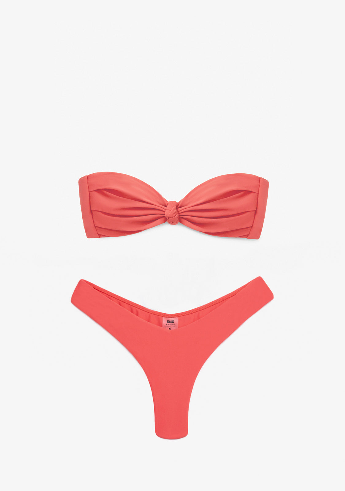 Top de biquíni cai-cai com nó central em coral. Sem armação. Com espuma removível. Alças removíveis com regulador ajustável. Fecho metálico.