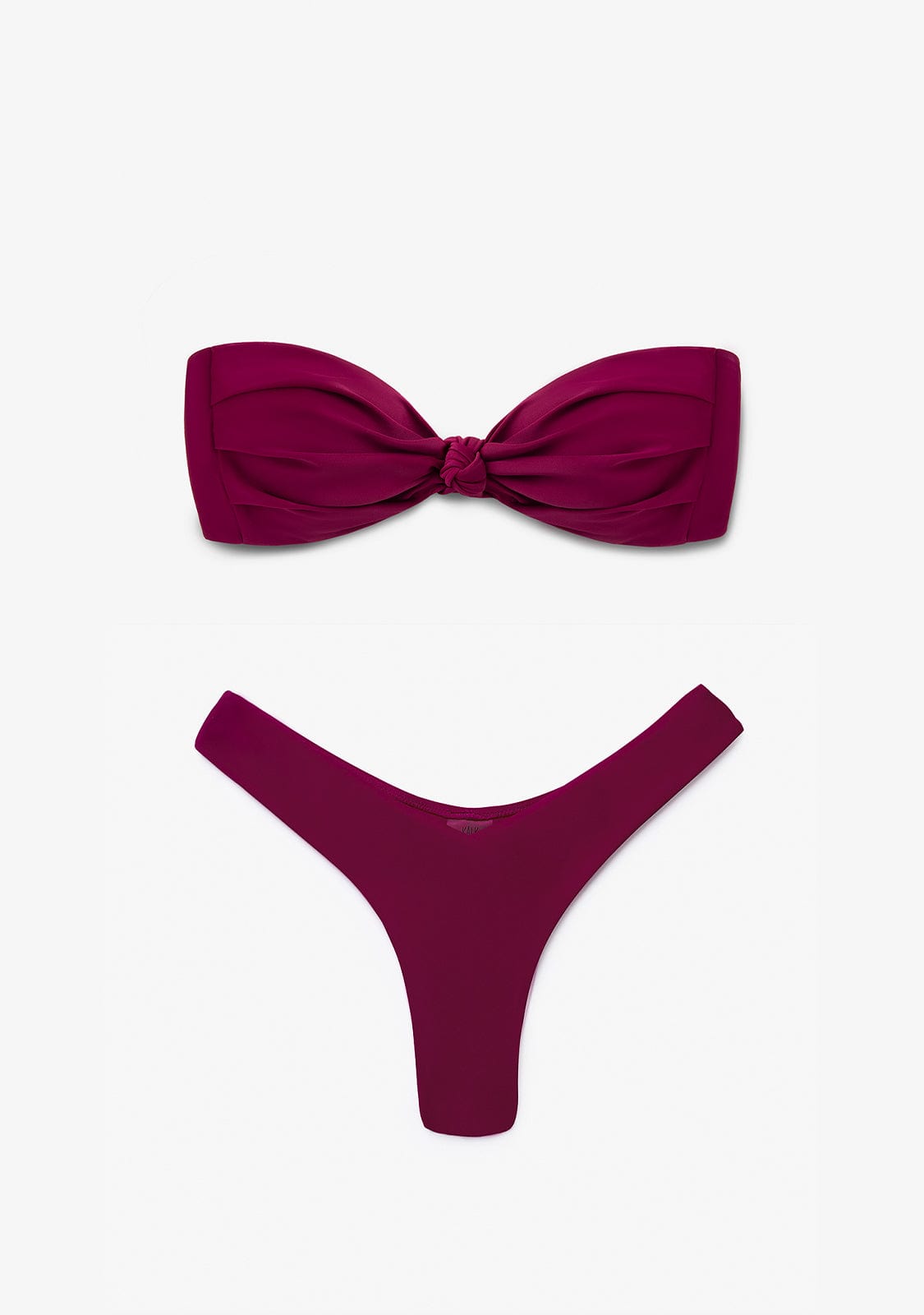 Top biquíni Bandeau com nó central em cor de vinho. Sem aro. Com espuma amovível. Alças amovíveis com regulador. Fecho de metal.