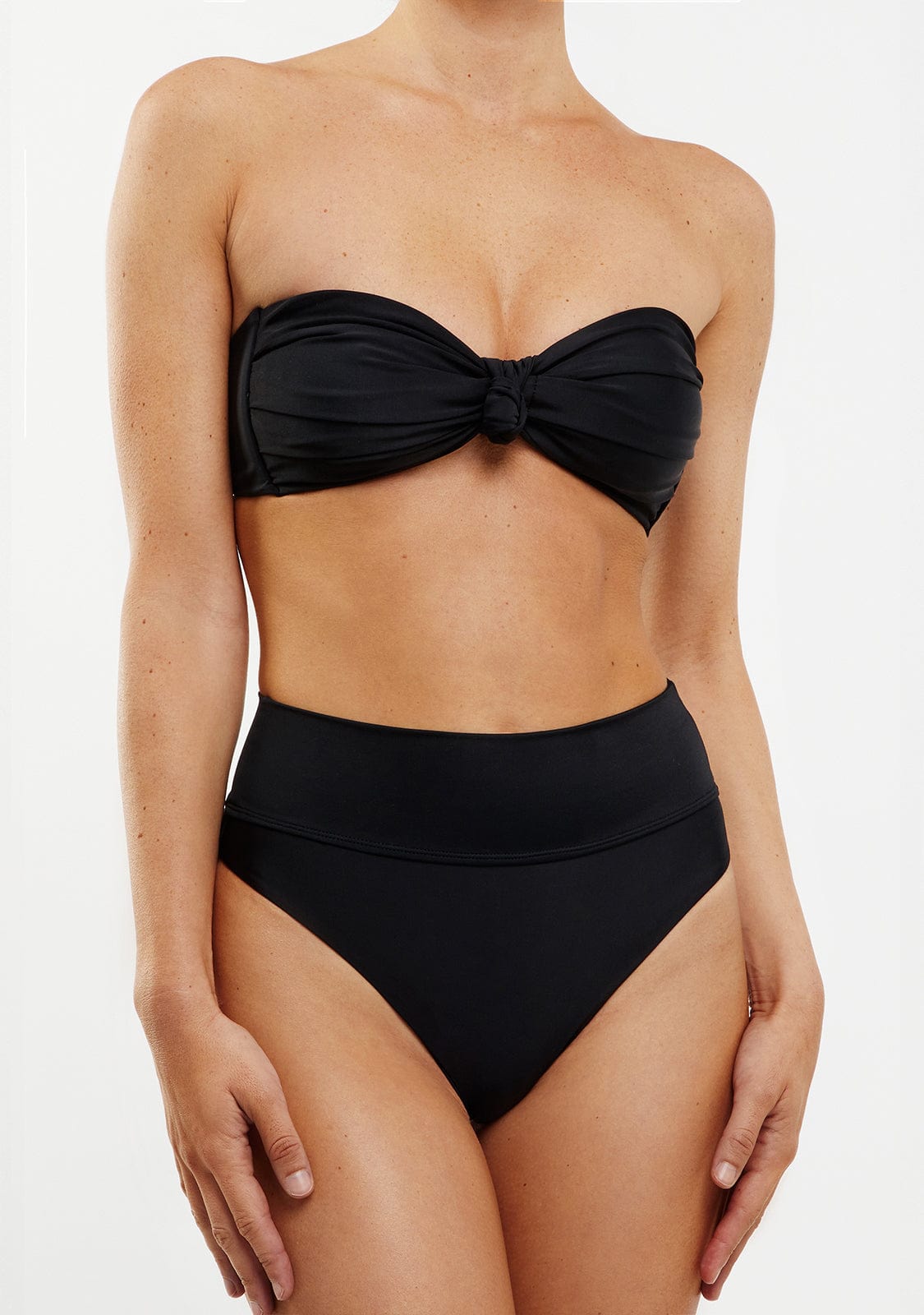 Top biquíni Bandeau com nó central em preto. Sem armação. Com espuma amovível. Alças amovíveis com regulador. Fecho de metal.