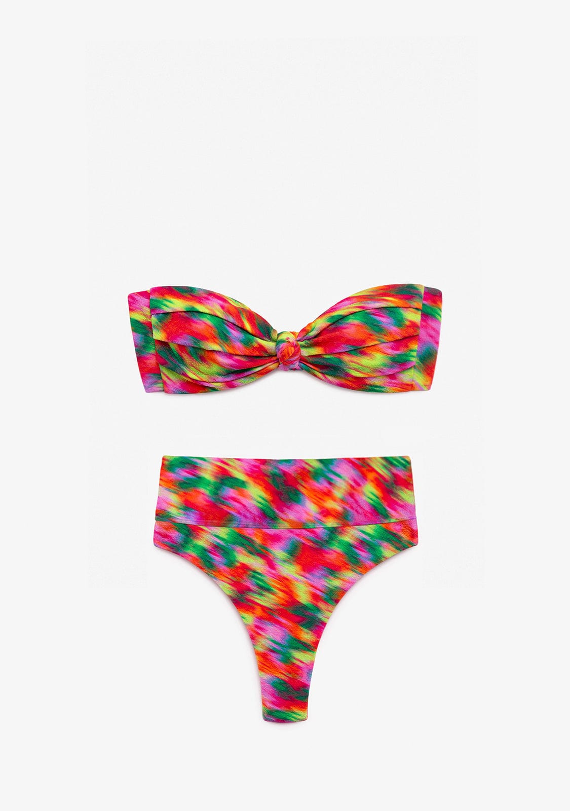 Top biquíni Bandeau com nó central com estampado multicolor. Sem armação. Com espuma amovível. Alças amovíveis com regulador. Fecho de metal.