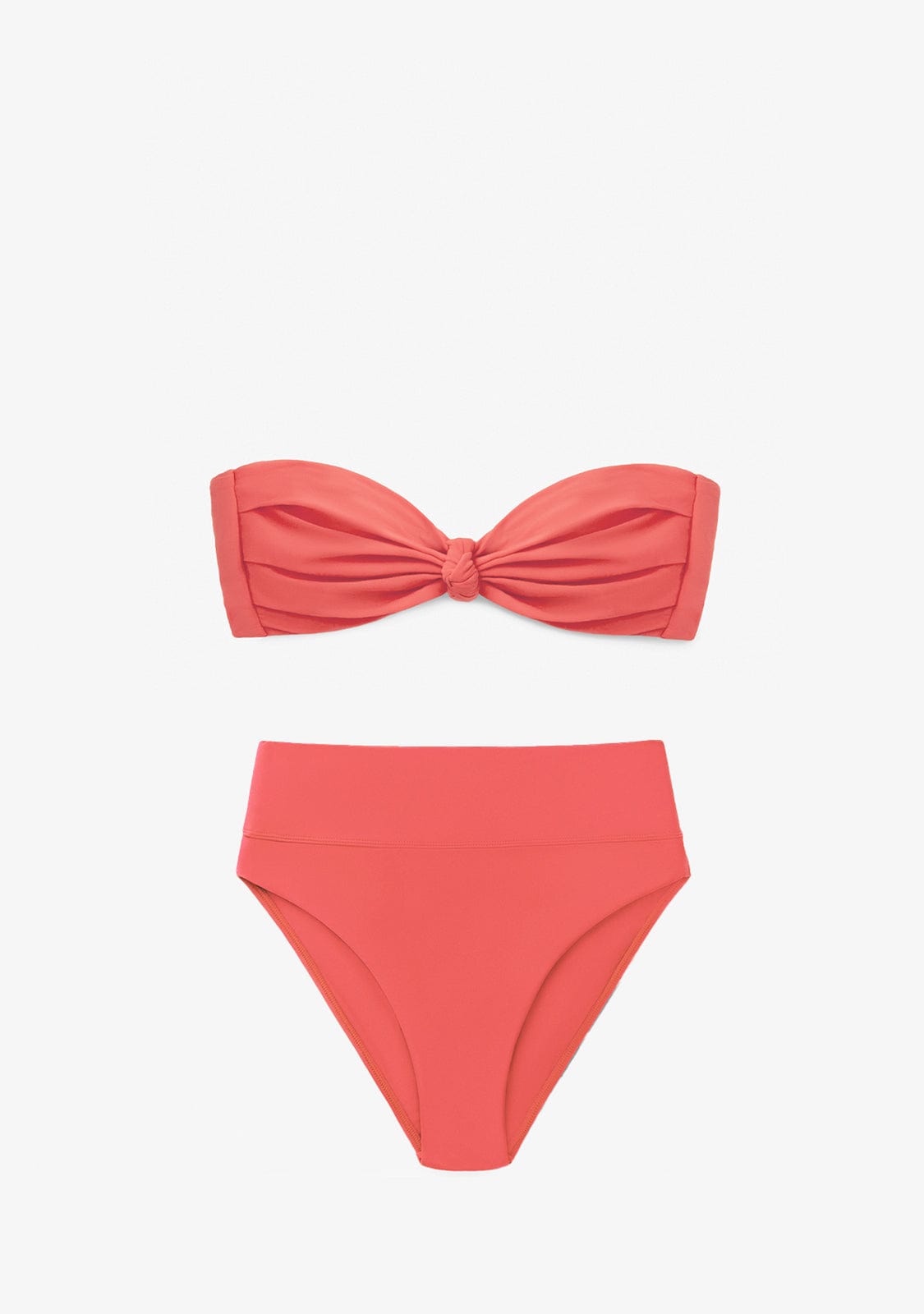 Top biquíni Bandeau com nó central em cor coral. Sem armação. Com espuma amovível. Alças amovíveis com regulador. Fecho de metal.