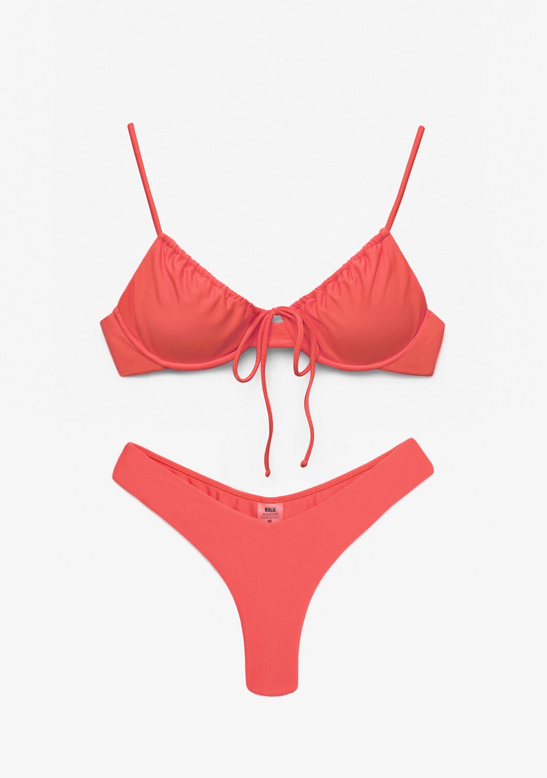 Biquíni brasileiro em coral. Em forma de V baixo. Cobertura reduzida. Com atilhos laterais. Detalhe de placa metálica retangular dourada com o logótipo Kalk.