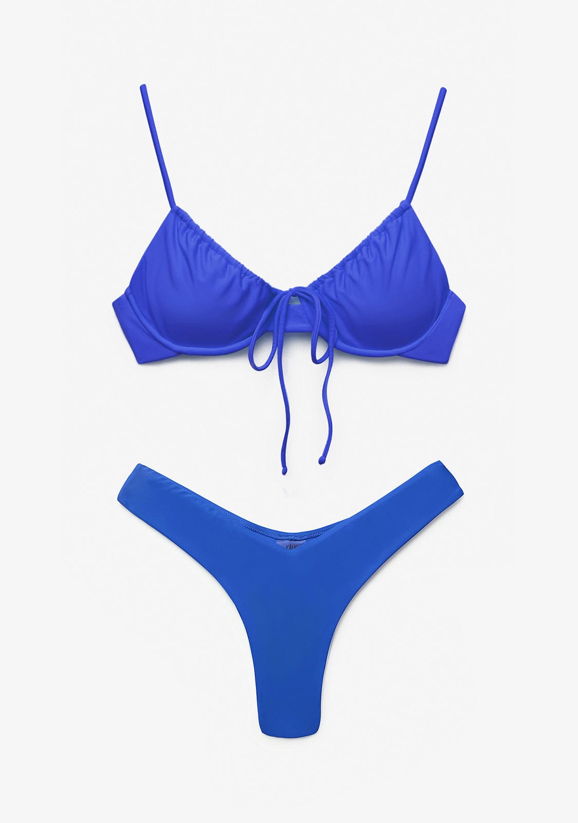 Biquíni brasileiro em azul índigo. Em forma de V baixo. Cobertura reduzida. Detalhe de placa metálica retangular dourada com o logótipo Kalk.
