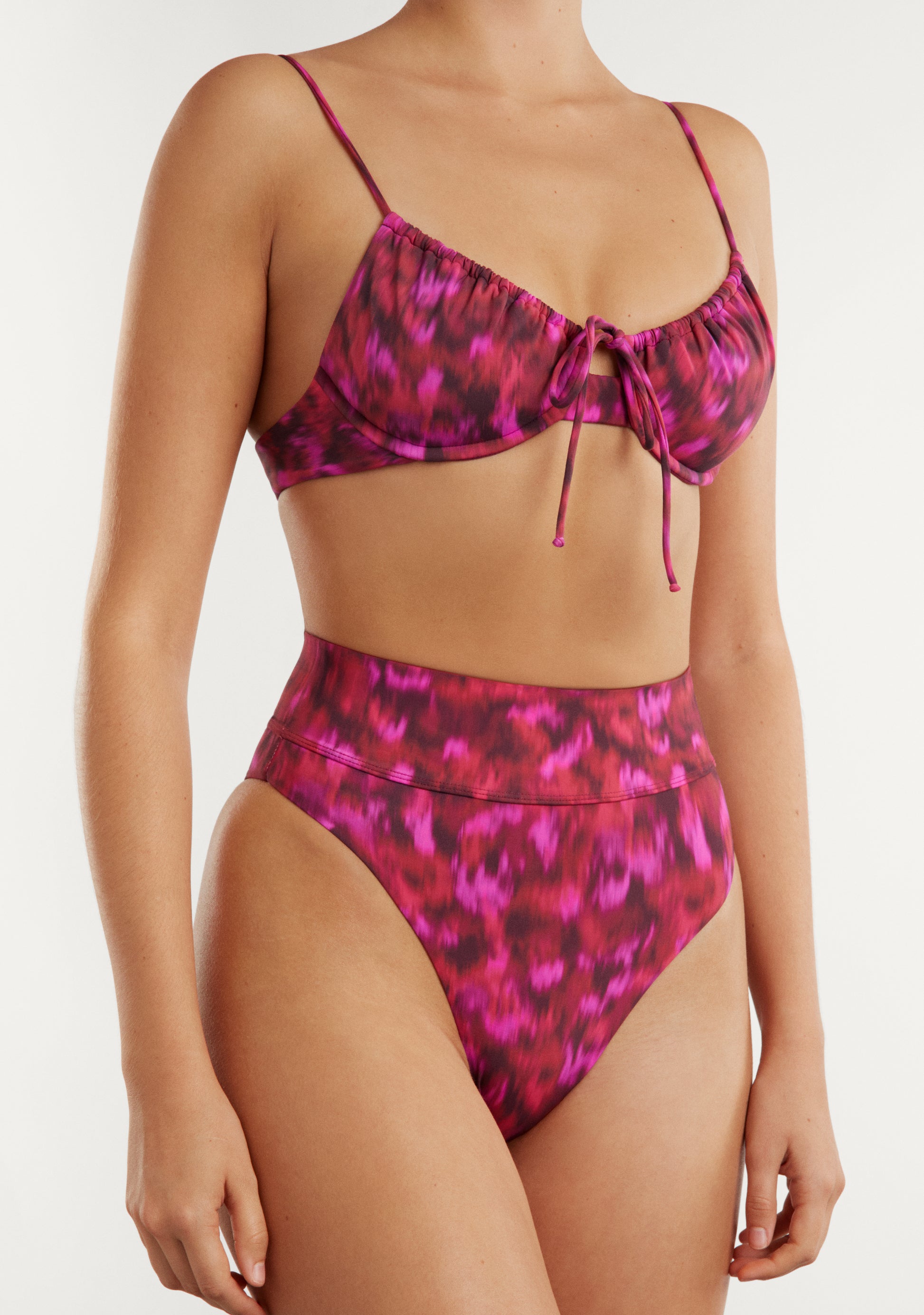 Top de biquíni balconette cereja match. Com armação. Sem espuma dentro. Alças ajustáveis. Fecho de laço. Cueca de biquíni estilo brasileiro na cor cereja com cintura alta e alta cobertura. Detalhe de placa metálica retangular dourada com logótipo Kalk.