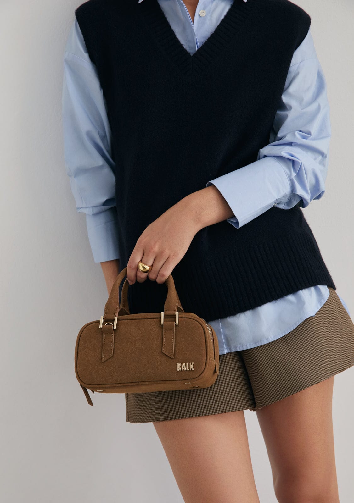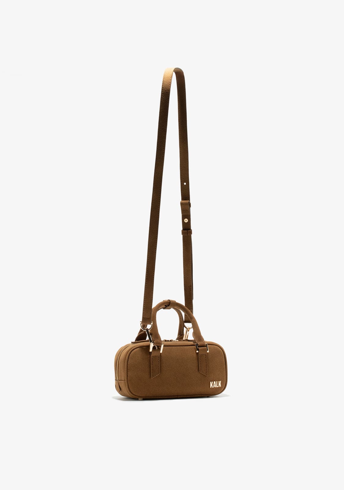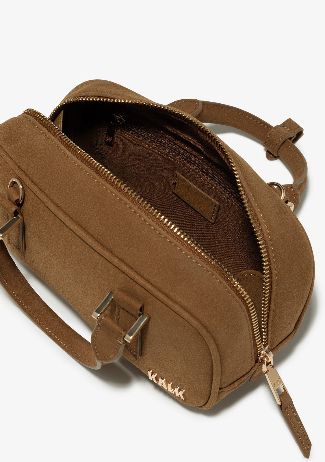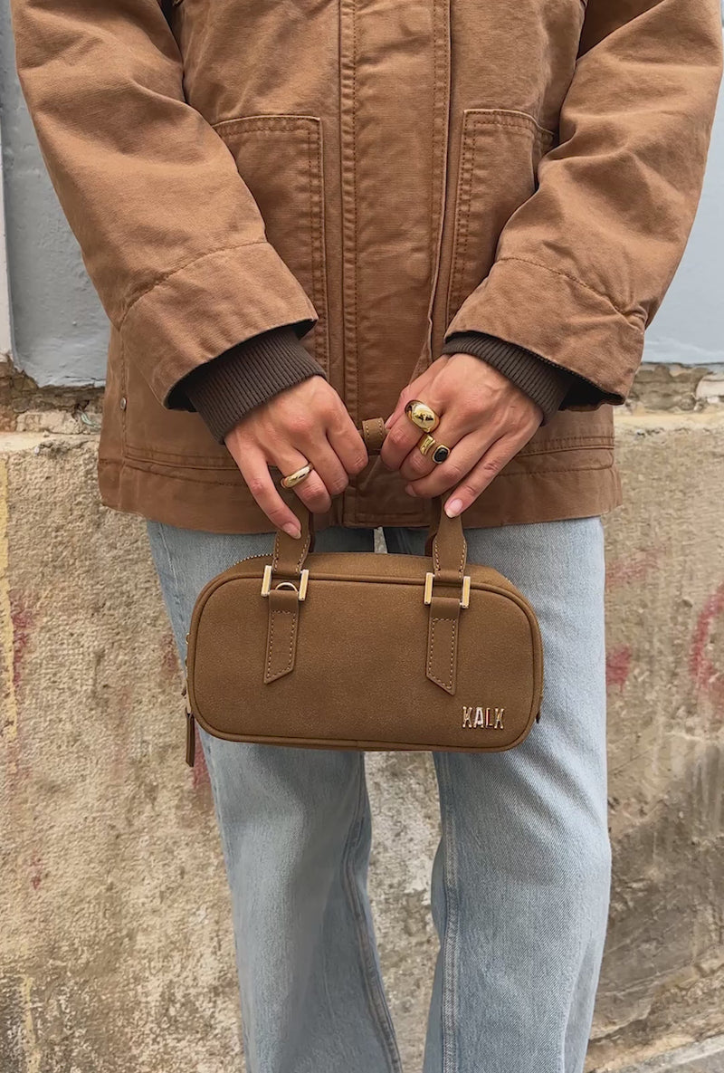 Kalk apresenta a Mini Bowling Bag Camel Kalk, uma mala camel de tamanho mini. Tem duas alças curtas que podes unir com uma fita com botão para transportá-la na mão. Esta mala de mulher é confeccionada em napa sintética e inclui um saco protetor para guardá-la quando não a usar.