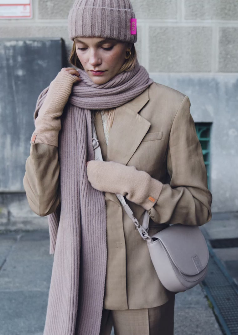 Kalk apresenta o novo Acessórios de inverno Coleção com designs exclusivos. O lenço bege feminino O toque ousado é que suas roupas de inverno estavam faltando.