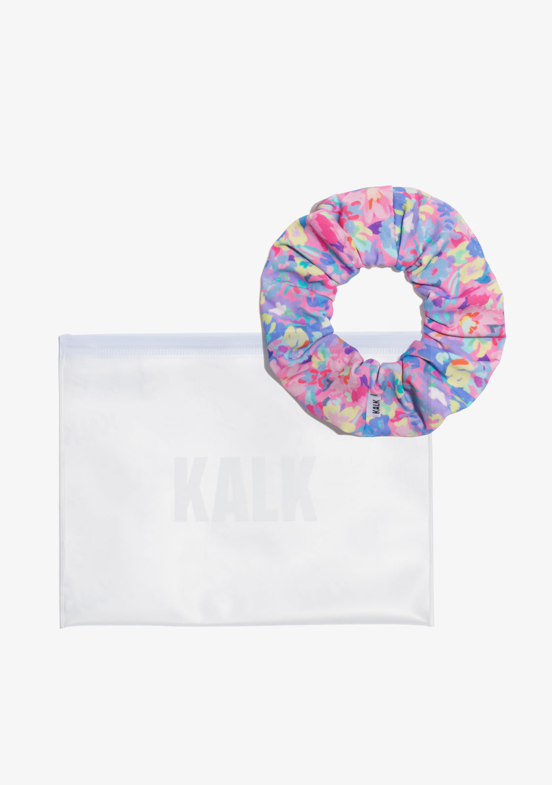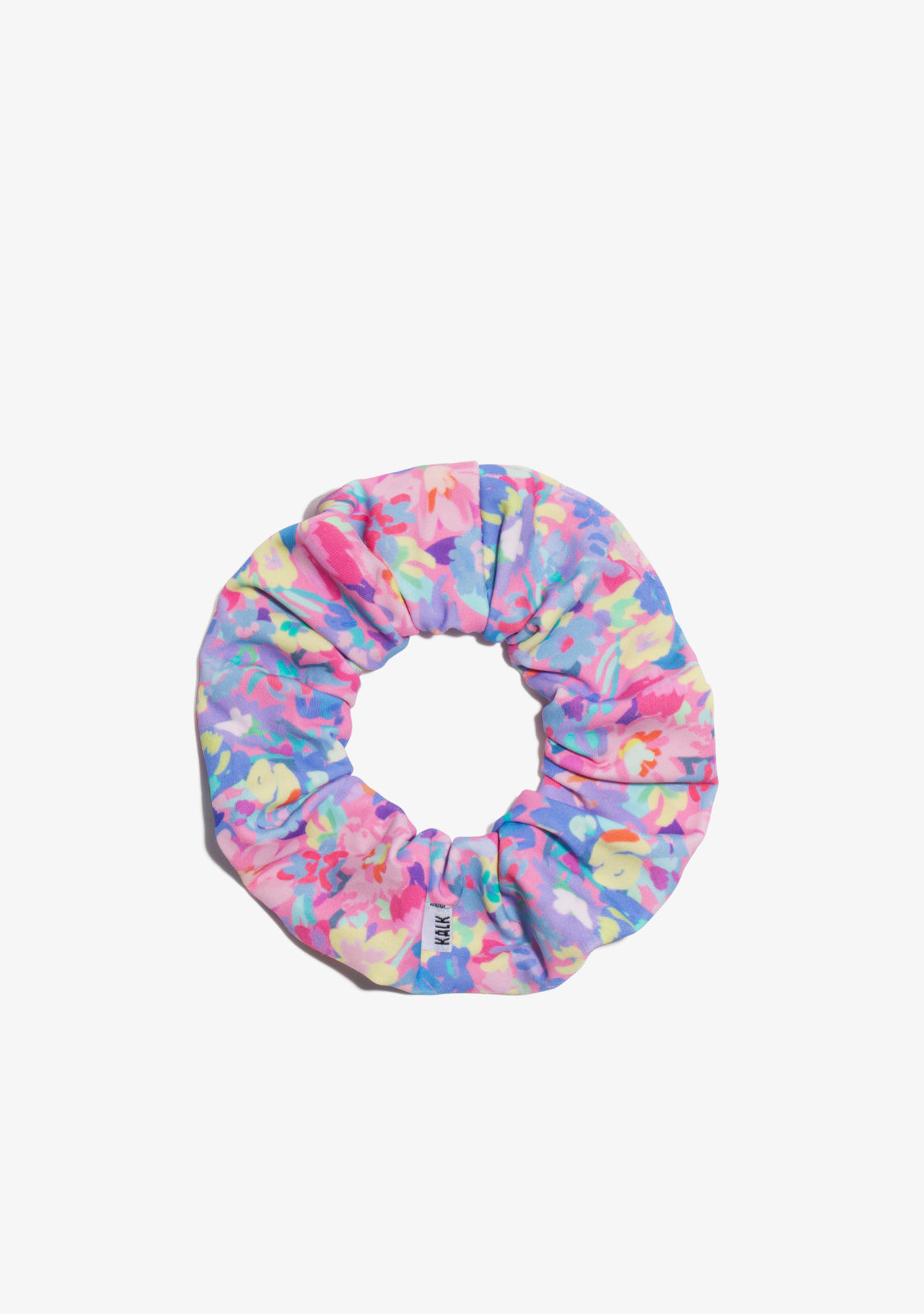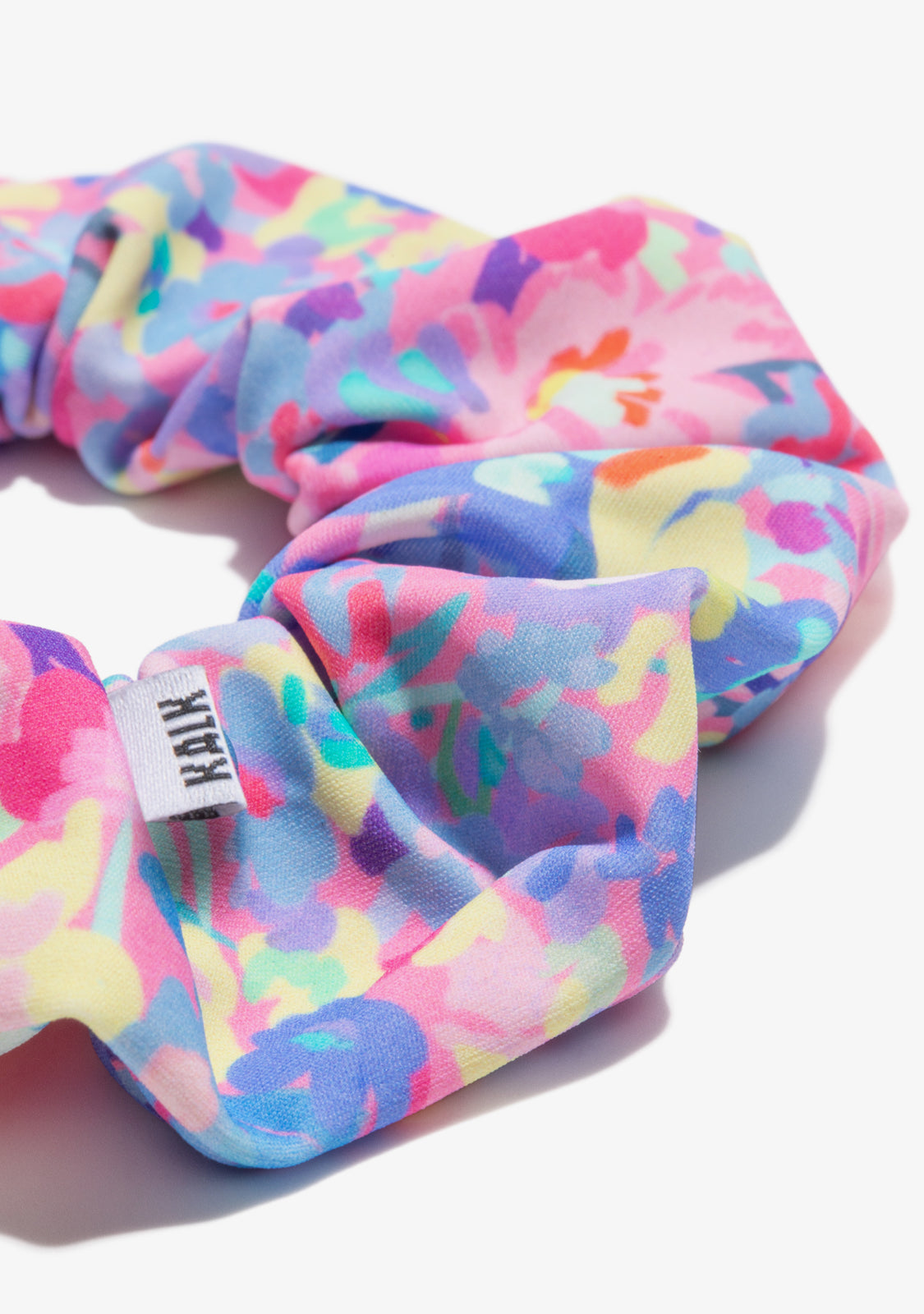 Tecido elástico com estampado Bliss. Pormenor da etiqueta Kalk.